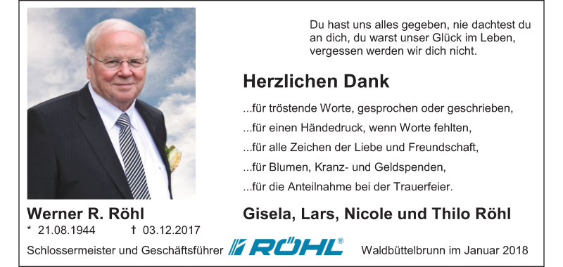 Hier finden Sie alle Traueranzeigen aus der Zeitung, die bisher für Werner R. Röhl erschienen sind. Weitere Traueranzeigen, die in der Zeitung erscheinen, werden hier ebenfalls aufgelistet