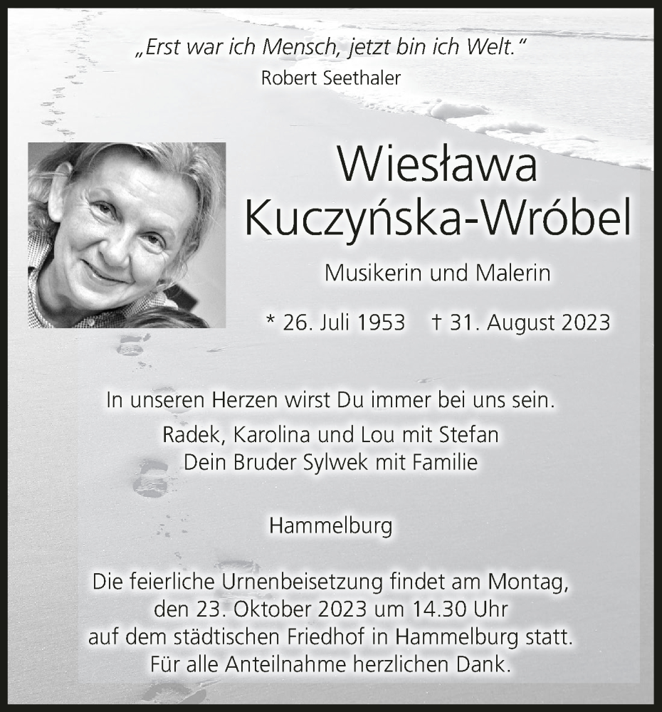 Hier finden Sie alle Traueranzeigen aus der Zeitung, die bisher für Wiestawa Kuczynska-Wrobel erschienen sind. Weitere Traueranzeigen, die in der Zeitung erscheinen, werden hier ebenfalls aufgelistet
