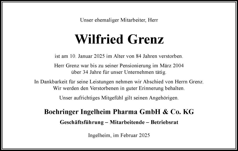 Hier finden Sie alle Traueranzeigen aus der Zeitung, die bisher für Wilfried Grenz erschienen sind. Weitere Traueranzeigen, die in der Zeitung erscheinen, werden hier ebenfalls aufgelistet