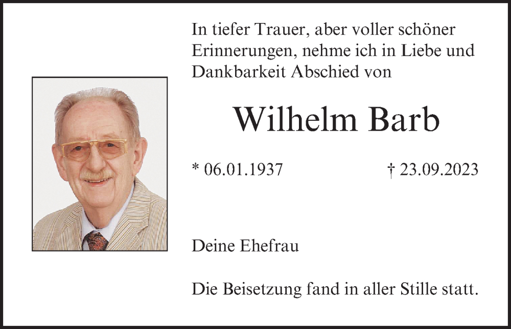 Hier finden Sie alle Traueranzeigen aus der Zeitung, die bisher für Wilhelm Barb erschienen sind. Weitere Traueranzeigen, die in der Zeitung erscheinen, werden hier ebenfalls aufgelistet