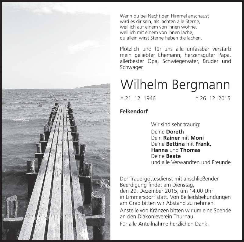 Hier finden Sie alle Traueranzeigen aus der Zeitung, die bisher für Wilhelm Bergmann erschienen sind. Weitere Traueranzeigen, die in der Zeitung erscheinen, werden hier ebenfalls aufgelistet