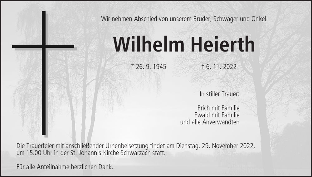 Hier finden Sie alle Traueranzeigen aus der Zeitung, die bisher für Wilhelm Heierth erschienen sind. Weitere Traueranzeigen, die in der Zeitung erscheinen, werden hier ebenfalls aufgelistet