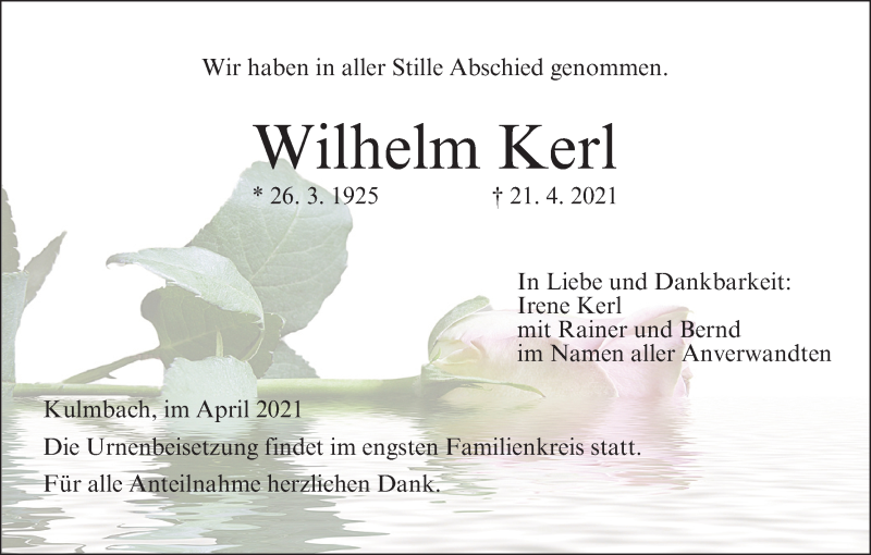 Hier finden Sie alle Traueranzeigen aus der Zeitung, die bisher für Wilhelm Kerl erschienen sind. Weitere Traueranzeigen, die in der Zeitung erscheinen, werden hier ebenfalls aufgelistet