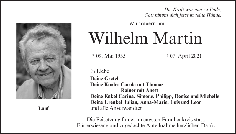 Hier finden Sie alle Traueranzeigen aus der Zeitung, die bisher für Wilhelm Martin erschienen sind. Weitere Traueranzeigen, die in der Zeitung erscheinen, werden hier ebenfalls aufgelistet