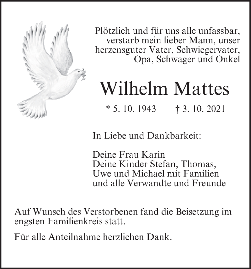 Hier finden Sie alle Traueranzeigen aus der Zeitung, die bisher für Wilhelm Mattes erschienen sind. Weitere Traueranzeigen, die in der Zeitung erscheinen, werden hier ebenfalls aufgelistet