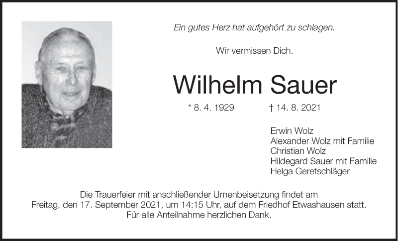 Hier finden Sie alle Traueranzeigen aus der Zeitung, die bisher für Wilhelm S-auer erschienen sind. Weitere Traueranzeigen, die in der Zeitung erscheinen, werden hier ebenfalls aufgelistet