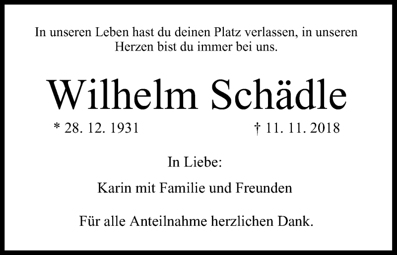 Hier finden Sie alle Traueranzeigen aus der Zeitung, die bisher für Wilhelm Schädle erschienen sind. Weitere Traueranzeigen, die in der Zeitung erscheinen, werden hier ebenfalls aufgelistet