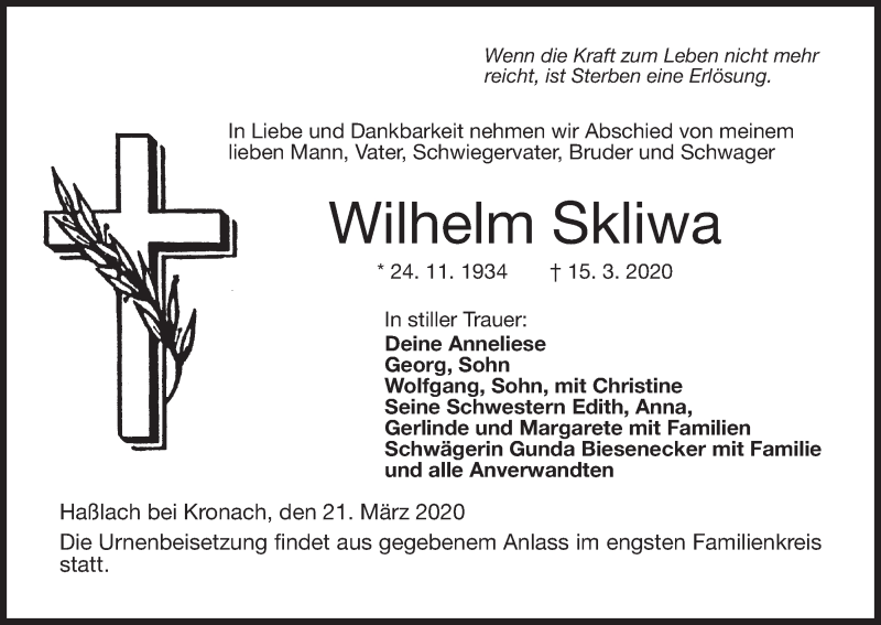 Hier finden Sie alle Traueranzeigen aus der Zeitung, die bisher für Wilhelm Skliwa erschienen sind. Weitere Traueranzeigen, die in der Zeitung erscheinen, werden hier ebenfalls aufgelistet