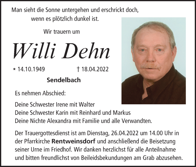 Hier finden Sie alle Traueranzeigen aus der Zeitung, die bisher für Willi Dehn erschienen sind. Weitere Traueranzeigen, die in der Zeitung erscheinen, werden hier ebenfalls aufgelistet