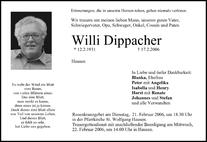 Hier finden Sie alle Traueranzeigen aus der Zeitung, die bisher für Willi Dippacher erschienen sind. Weitere Traueranzeigen, die in der Zeitung erscheinen, werden hier ebenfalls aufgelistet