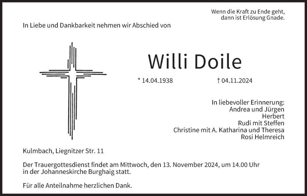Hier finden Sie alle Traueranzeigen aus der Zeitung, die bisher für Willi Doile erschienen sind. Weitere Traueranzeigen, die in der Zeitung erscheinen, werden hier ebenfalls aufgelistet