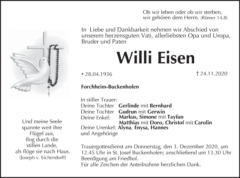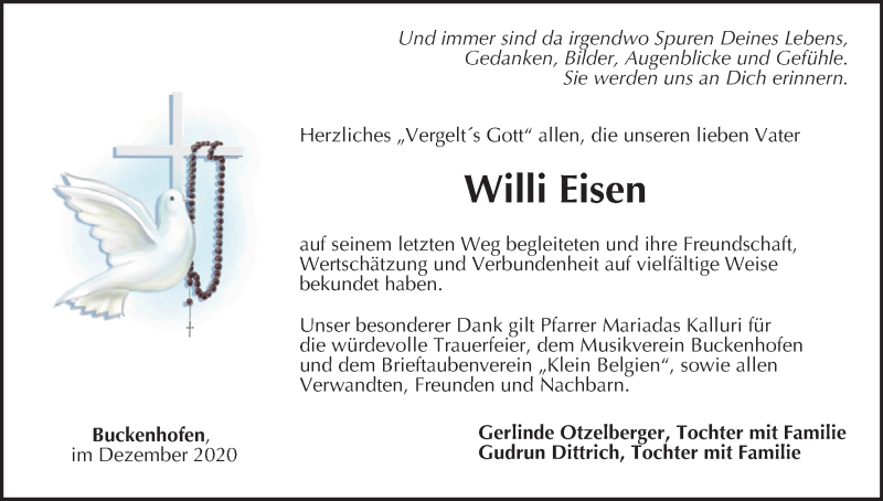 Hier finden Sie alle Traueranzeigen aus der Zeitung, die bisher für Willi Eisen erschienen sind. Weitere Traueranzeigen, die in der Zeitung erscheinen, werden hier ebenfalls aufgelistet