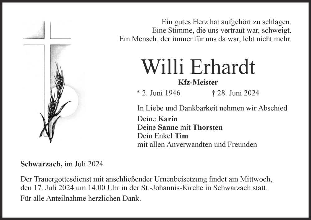 Hier finden Sie alle Traueranzeigen aus der Zeitung, die bisher für Willi Erhardt erschienen sind. Weitere Traueranzeigen, die in der Zeitung erscheinen, werden hier ebenfalls aufgelistet
