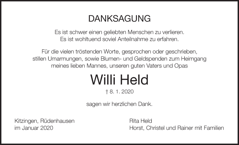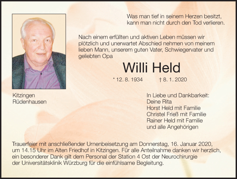Hier finden Sie alle Traueranzeigen aus der Zeitung, die bisher für Willi Held erschienen sind. Weitere Traueranzeigen, die in der Zeitung erscheinen, werden hier ebenfalls aufgelistet