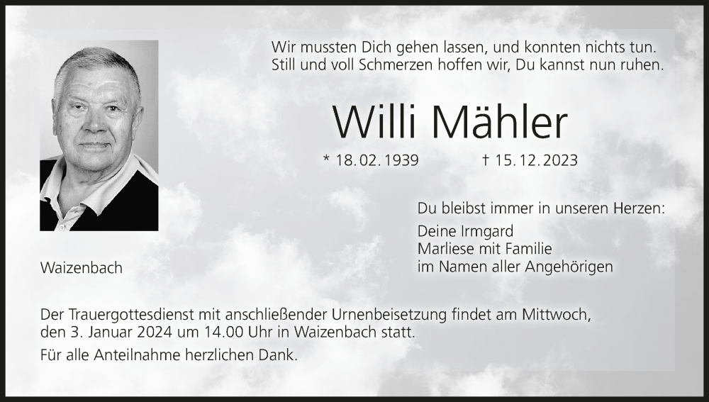 Hier finden Sie alle Traueranzeigen aus der Zeitung, die bisher für Willi Mähler erschienen sind. Weitere Traueranzeigen, die in der Zeitung erscheinen, werden hier ebenfalls aufgelistet