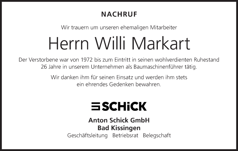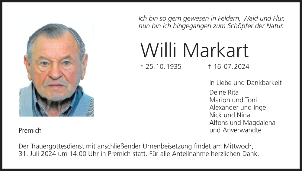 Hier finden Sie alle Traueranzeigen aus der Zeitung, die bisher für Willi Markart erschienen sind. Weitere Traueranzeigen, die in der Zeitung erscheinen, werden hier ebenfalls aufgelistet