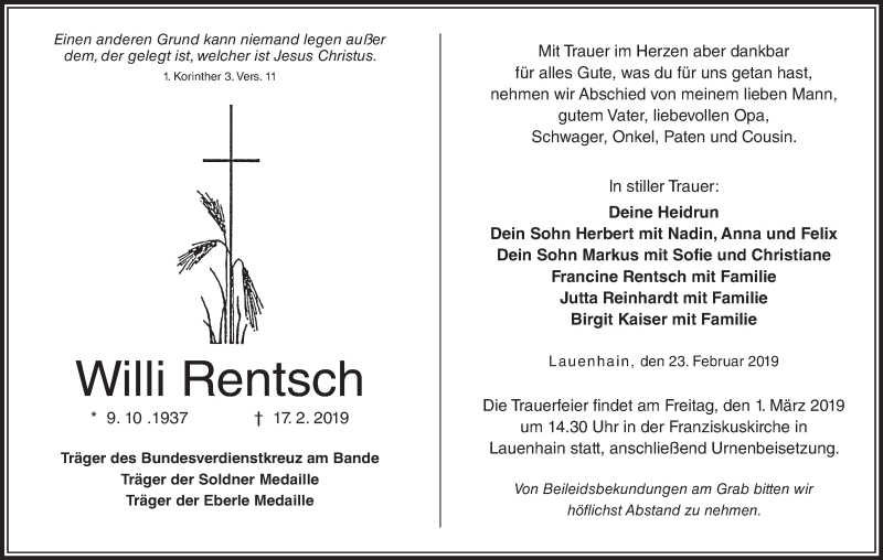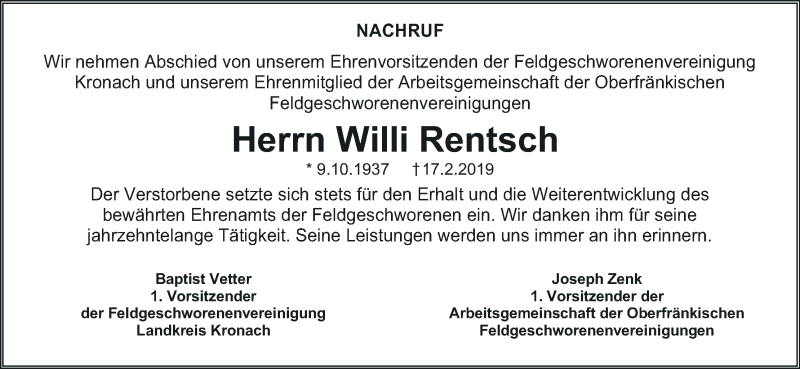 Hier finden Sie alle Traueranzeigen aus der Zeitung, die bisher für Willi Rentsch erschienen sind. Weitere Traueranzeigen, die in der Zeitung erscheinen, werden hier ebenfalls aufgelistet