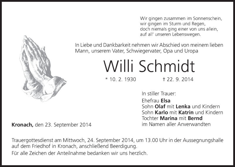 Hier finden Sie alle Traueranzeigen aus der Zeitung, die bisher für Willi Schmidt erschienen sind. Weitere Traueranzeigen, die in der Zeitung erscheinen, werden hier ebenfalls aufgelistet