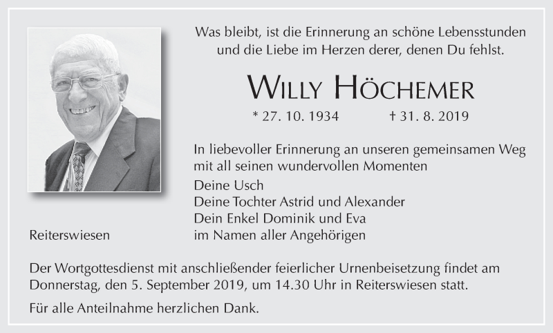 Hier finden Sie alle Traueranzeigen aus der Zeitung, die bisher für Willy Höchemer erschienen sind. Weitere Traueranzeigen, die in der Zeitung erscheinen, werden hier ebenfalls aufgelistet