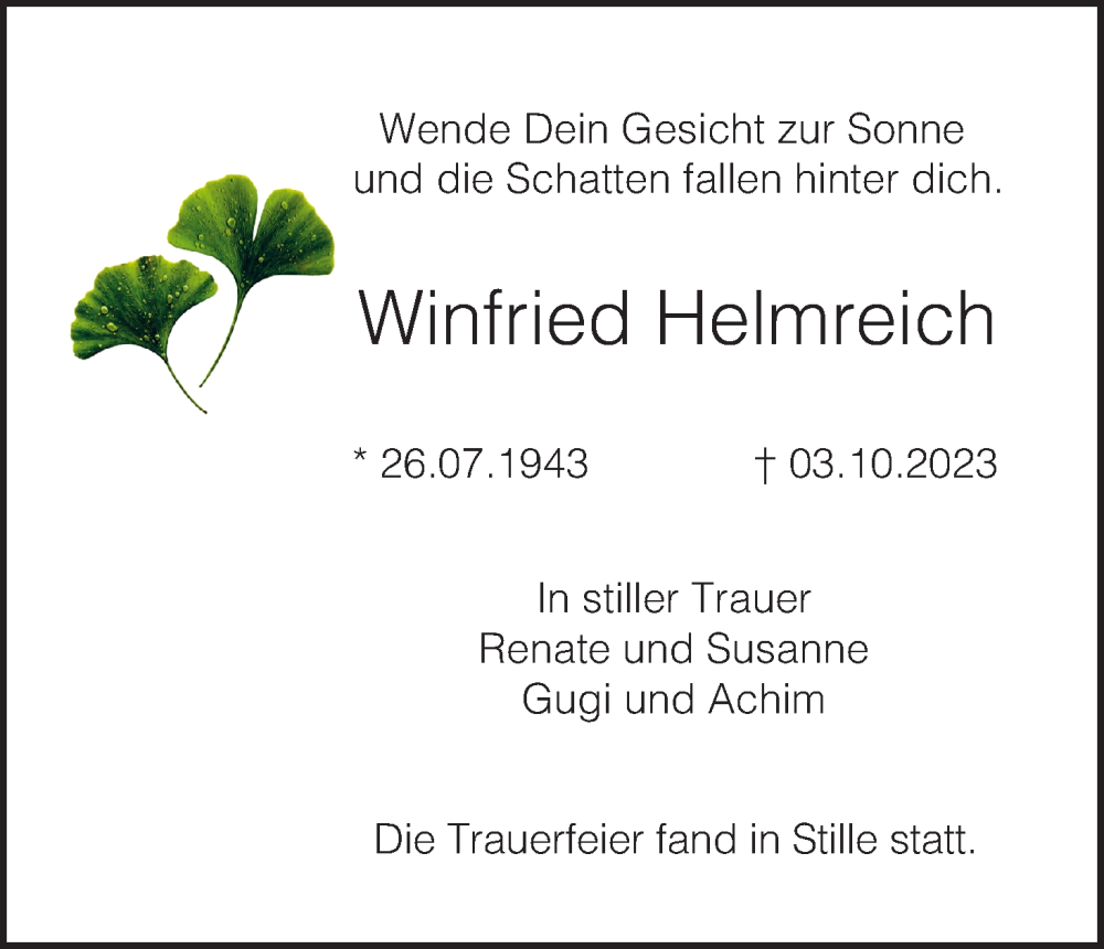 Hier finden Sie alle Traueranzeigen aus der Zeitung, die bisher für Winfried Helmreich erschienen sind. Weitere Traueranzeigen, die in der Zeitung erscheinen, werden hier ebenfalls aufgelistet