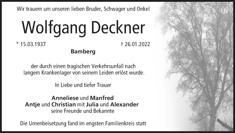 Hier finden Sie alle Traueranzeigen aus der Zeitung, die bisher für Wolfgang Deckner erschienen sind. Weitere Traueranzeigen, die in der Zeitung erscheinen, werden hier ebenfalls aufgelistet