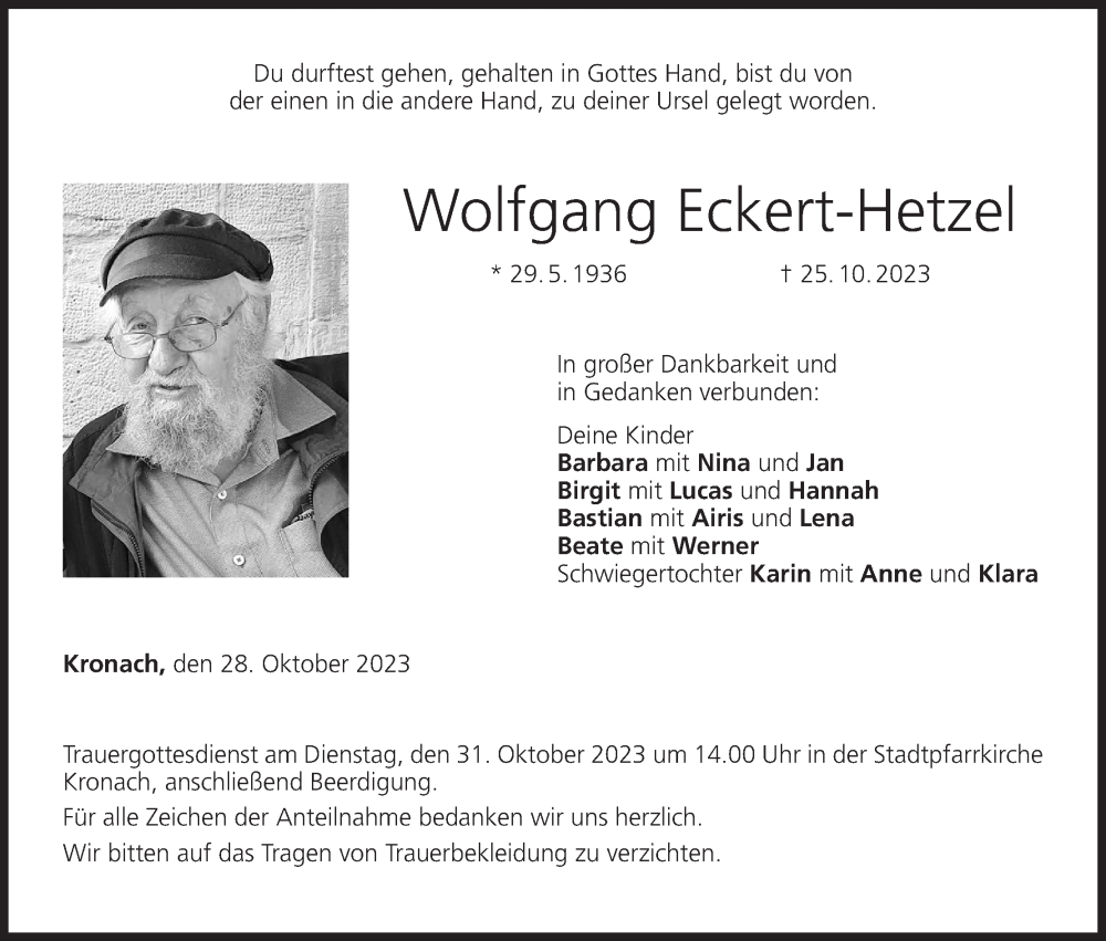 Hier finden Sie alle Traueranzeigen aus der Zeitung, die bisher für Wolfgang Eckert-Hetzel erschienen sind. Weitere Traueranzeigen, die in der Zeitung erscheinen, werden hier ebenfalls aufgelistet