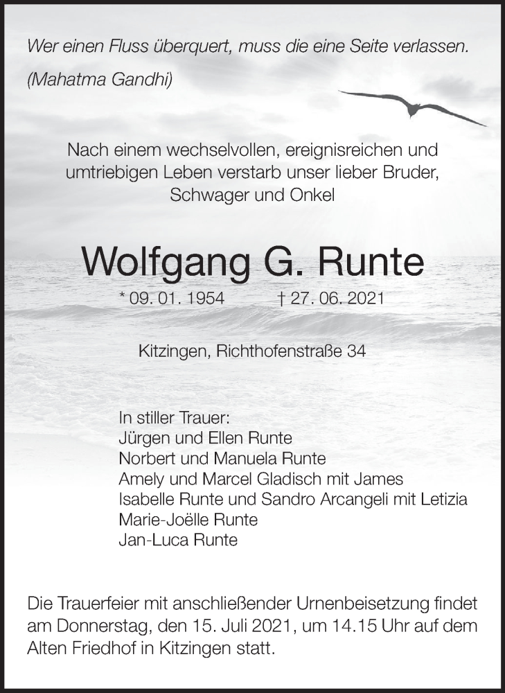 Hier finden Sie alle Traueranzeigen aus der Zeitung, die bisher für Wolfgang G. Runte erschienen sind. Weitere Traueranzeigen, die in der Zeitung erscheinen, werden hier ebenfalls aufgelistet