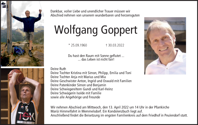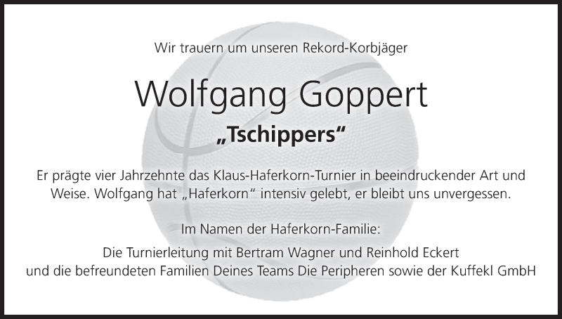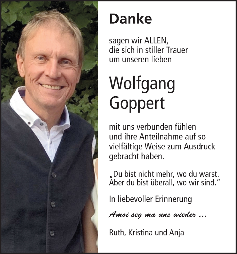 Hier finden Sie alle Traueranzeigen aus der Zeitung, die bisher für Wolfgang Goppert erschienen sind. Weitere Traueranzeigen, die in der Zeitung erscheinen, werden hier ebenfalls aufgelistet
