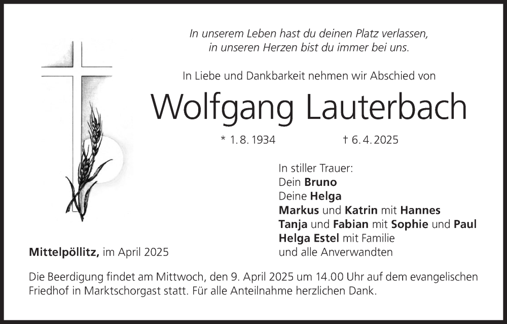 Hier finden Sie alle Traueranzeigen aus der Zeitung, die bisher für Wolfgang Lauterbach erschienen sind. Weitere Traueranzeigen, die in der Zeitung erscheinen, werden hier ebenfalls aufgelistet