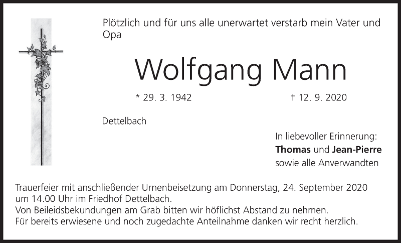 Hier finden Sie alle Traueranzeigen aus der Zeitung, die bisher für Wolfgang Mann erschienen sind. Weitere Traueranzeigen, die in der Zeitung erscheinen, werden hier ebenfalls aufgelistet