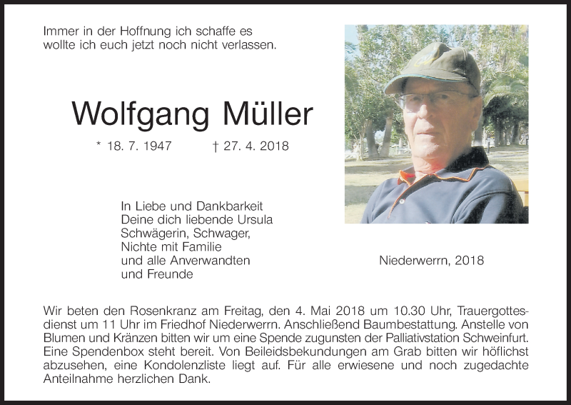 Hier finden Sie alle Traueranzeigen aus der Zeitung, die bisher für Wolfgang Müller erschienen sind. Weitere Traueranzeigen, die in der Zeitung erscheinen, werden hier ebenfalls aufgelistet
