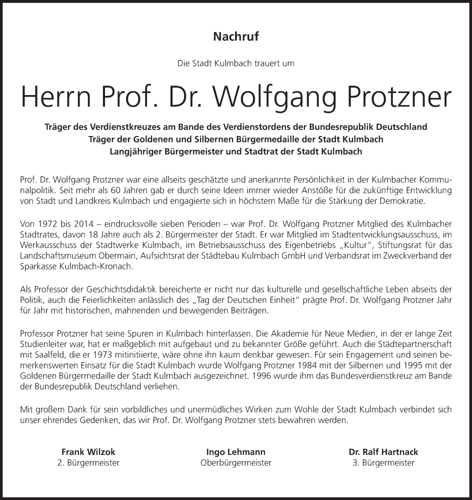 Hier finden Sie alle Traueranzeigen aus der Zeitung, die bisher für Wolfgang Protzner erschienen sind. Weitere Traueranzeigen, die in der Zeitung erscheinen, werden hier ebenfalls aufgelistet
