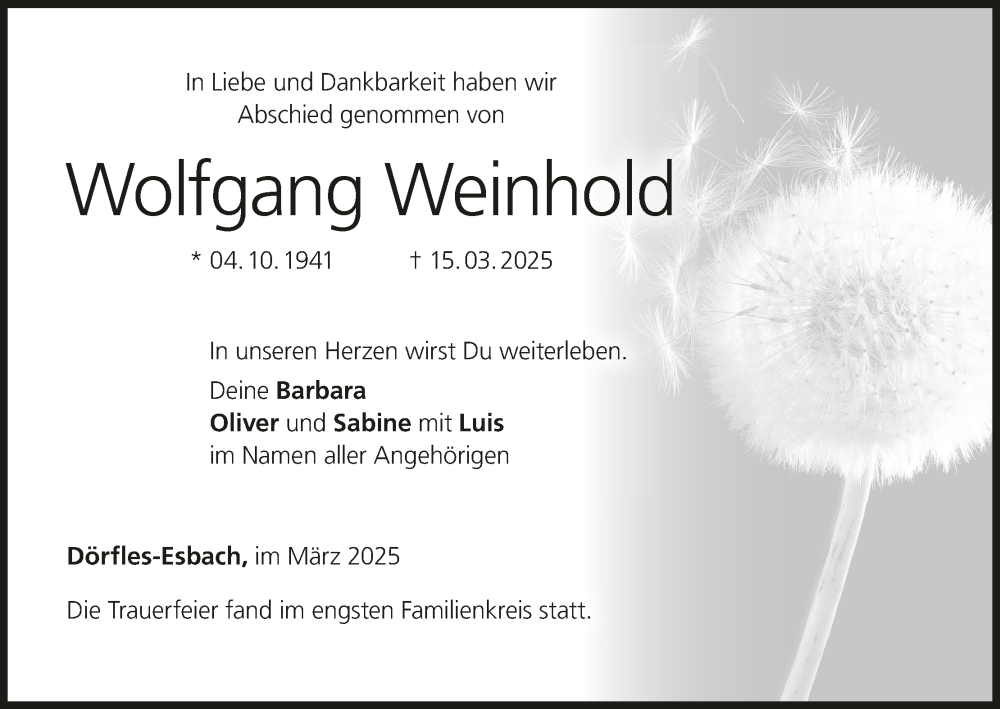 Hier finden Sie alle Traueranzeigen aus der Zeitung, die bisher für Wolfgang Weinhold erschienen sind. Weitere Traueranzeigen, die in der Zeitung erscheinen, werden hier ebenfalls aufgelistet