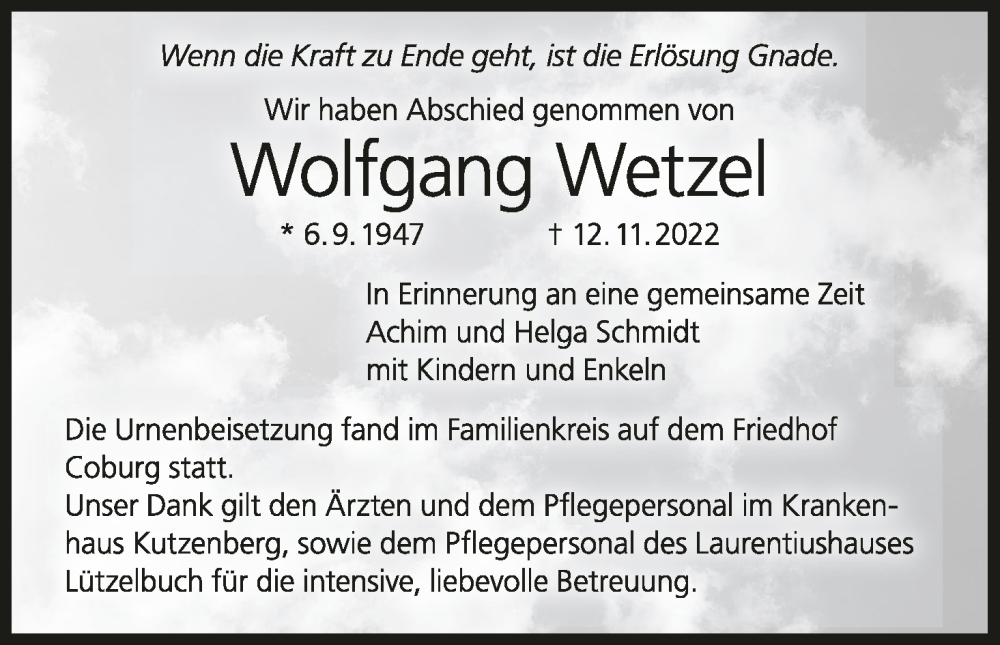 Hier finden Sie alle Traueranzeigen aus der Zeitung, die bisher für Wolfgang Wetzel erschienen sind. Weitere Traueranzeigen, die in der Zeitung erscheinen, werden hier ebenfalls aufgelistet