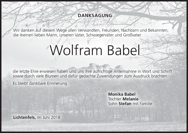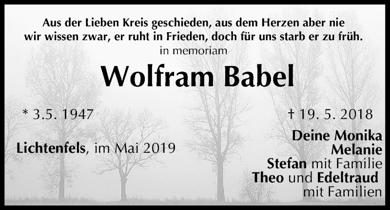 Hier finden Sie alle Traueranzeigen aus der Zeitung, die bisher für Wolfram Babel erschienen sind. Weitere Traueranzeigen, die in der Zeitung erscheinen, werden hier ebenfalls aufgelistet
