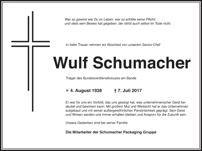 Hier finden Sie alle Traueranzeigen aus der Zeitung, die bisher für Wulf Schumacher erschienen sind. Weitere Traueranzeigen, die in der Zeitung erscheinen, werden hier ebenfalls aufgelistet